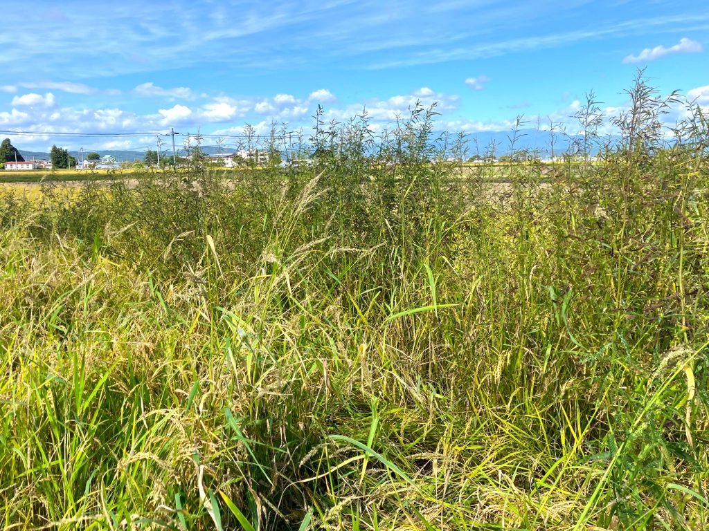 この雑草は圃場を落水したとたんに勢力的に生長します。抜いたら種を落とさないように圃場から持ち出す必要があります。一粒の種が、100倍以上に増えていくからです。家族総出で圃場から抜き出しては運び、次の圃場へ。何日もかかります。