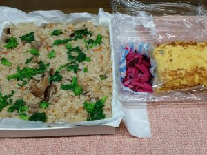 菜の花を散らした炊き込みご飯、卵焼き、手作り紅ショウガ。早速お昼に頂きます。